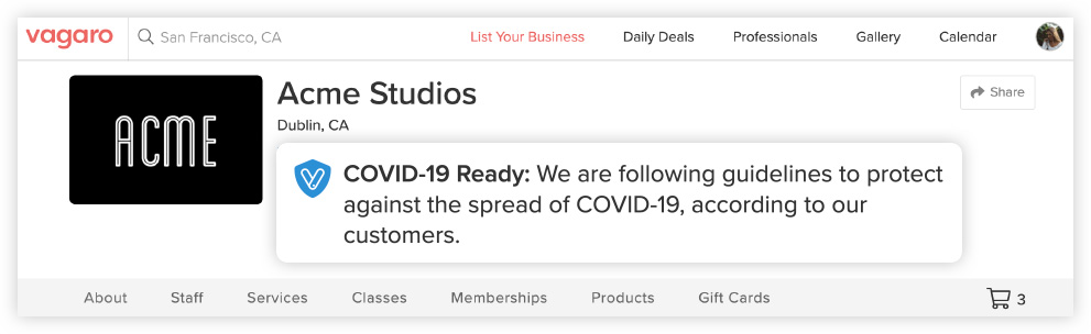 The COVID-19 Ready badge distinguishes your business as a COVID-Clean Business on Vagaro.com and on the Vagaro Client App. It is awarded when you receive 5 or more positive safety ratings from visiting clients and it provides consumers with the confidence to book their next appointment with you.