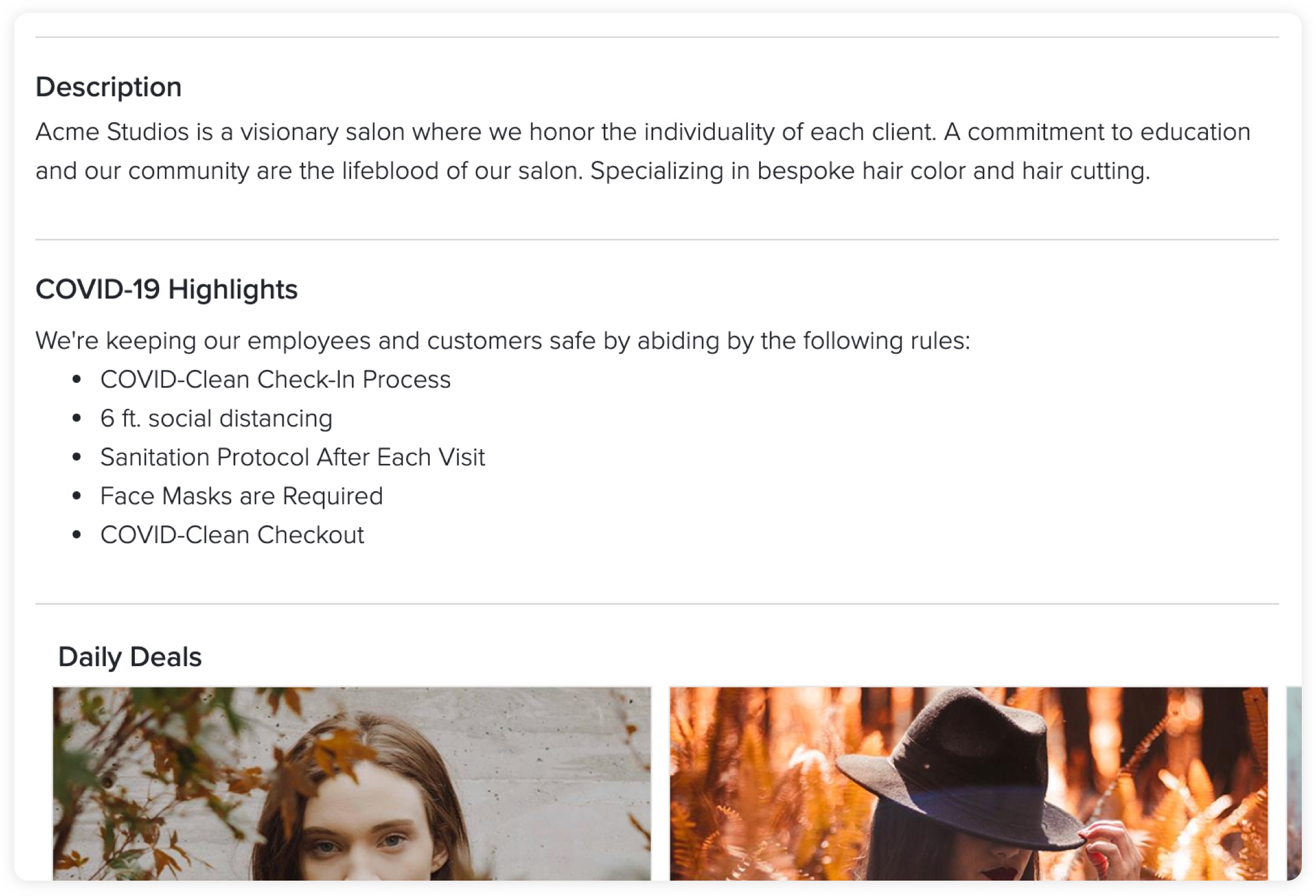 Each business page displayed on Vagaro.com and on the Vagaro Client App now includes a COVID-19 Highlights section, which enables business owners to share the health and safety measures they are taking to protect consumers and staff.