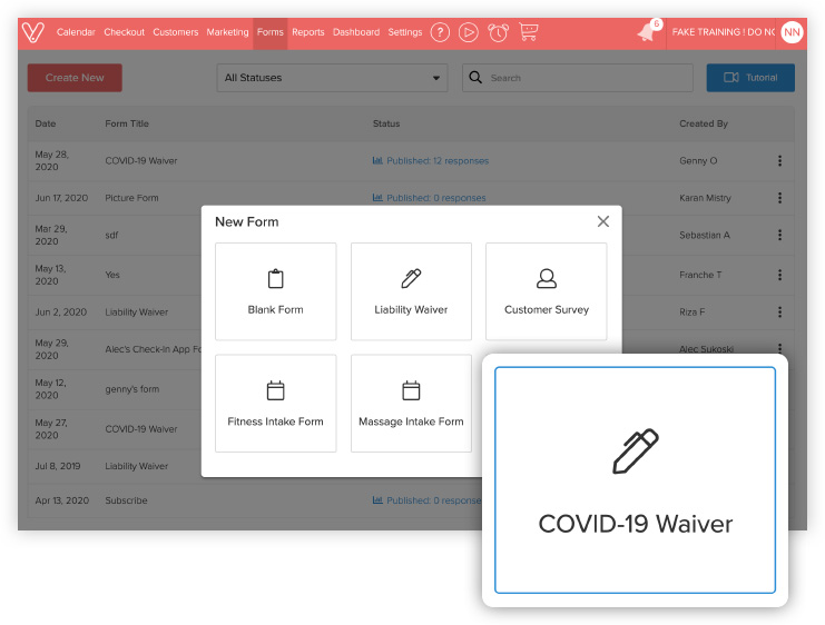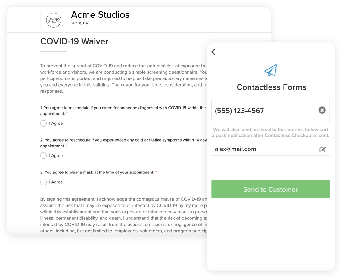 Protect your business with a COVID-19 Liability Waiver. Quickly use a template or build a custom form that fits your business needs. Have clients fill out a form for every online booking or require the form for specific services & classes only.