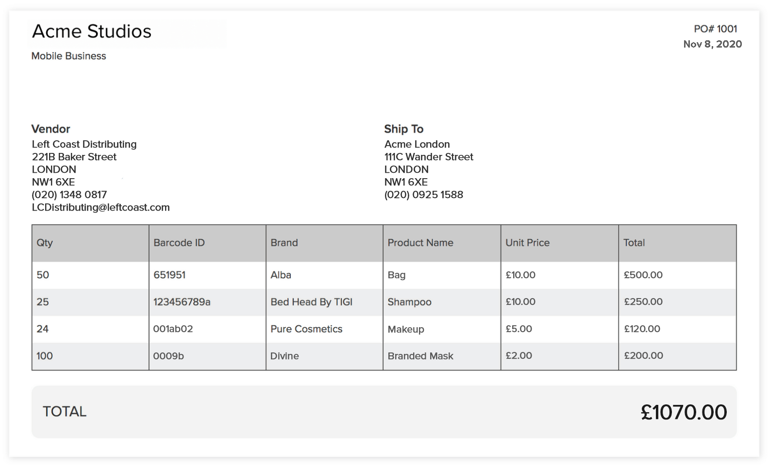 Create and send purchase orders with automatic detection of low-quantity products. Email purchase orders to your vendors and print them out for your records. When the order comes in, mark the order as received and the products will automatically be imported into your inventory.