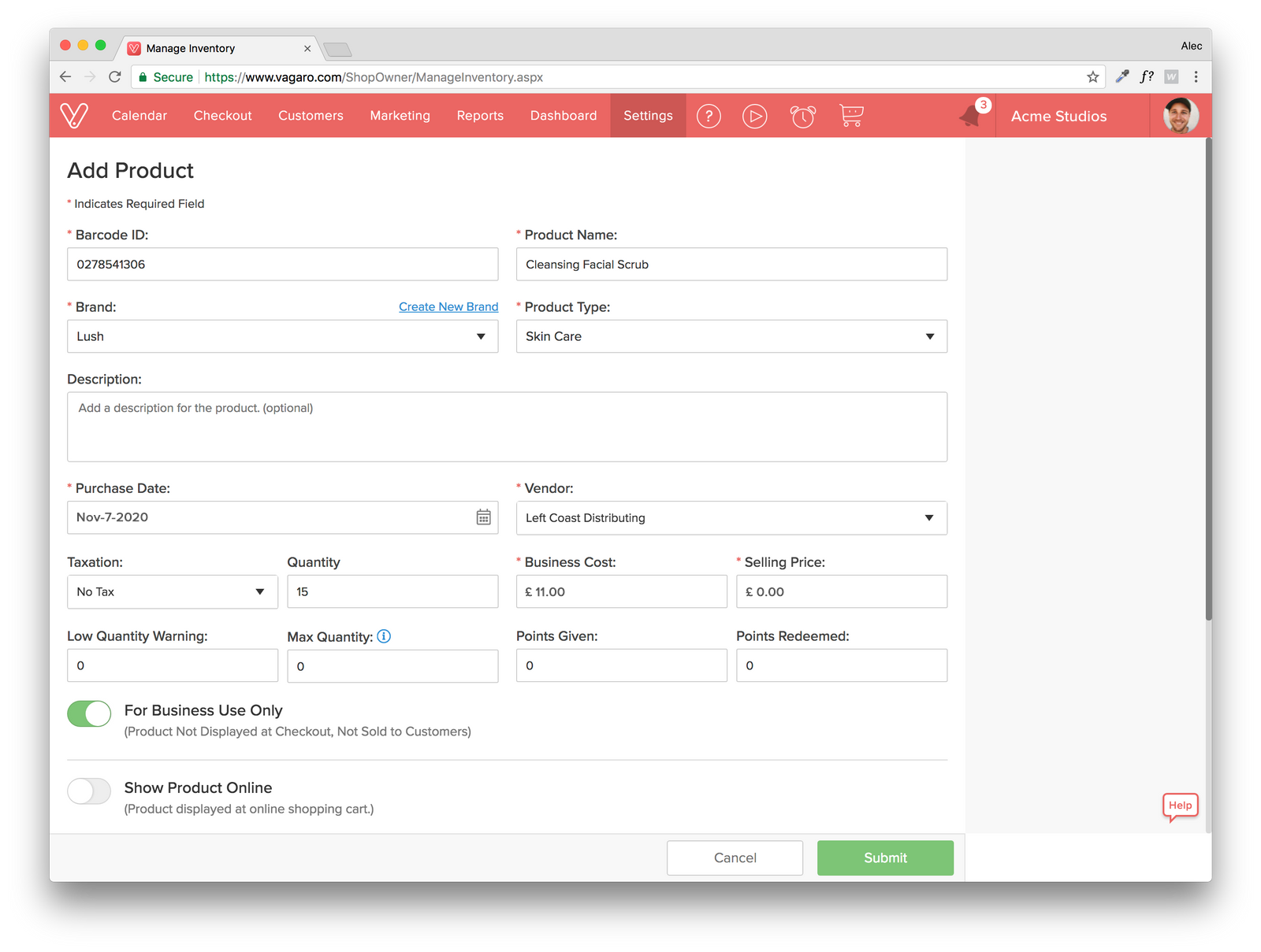Vagaro can import your entire inventory for you, free of charge. You can also add new products one at a time. Upload images for each product and set a business cost and a sales price. Set a low quantity warning for products and even a max quantity level which will automatically reorder products as they get low.