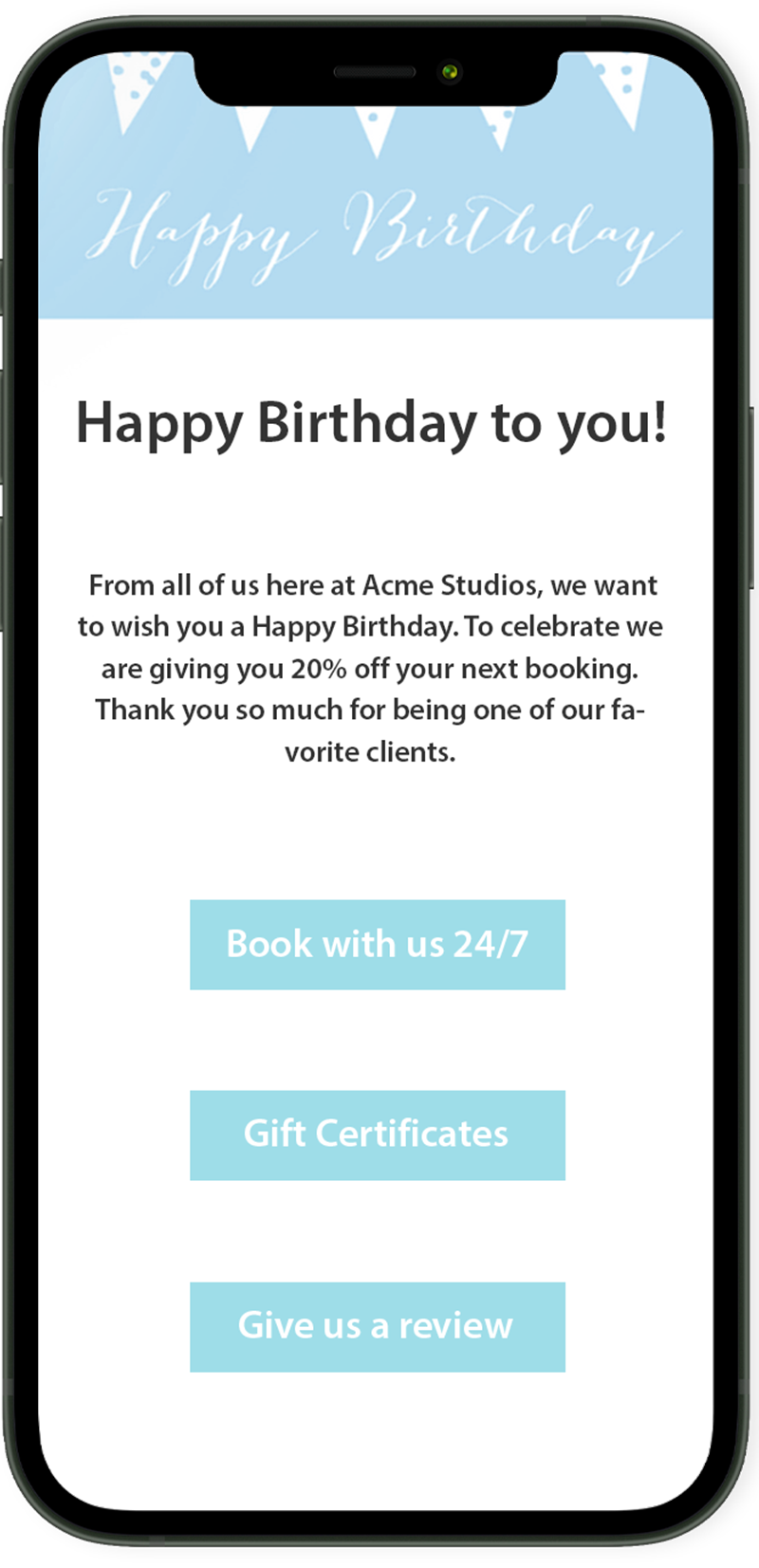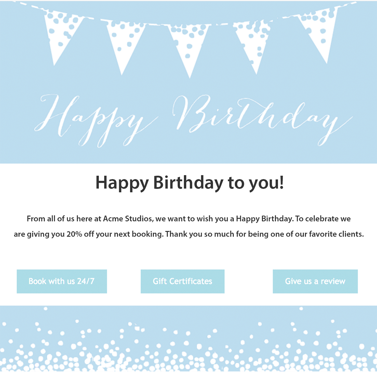 Take advantage of our email marketing tools to send emails to your customers and employees. Wish them a happy birthday, invite them to like your Facebook page, or remind them that they can book with you 24/7.