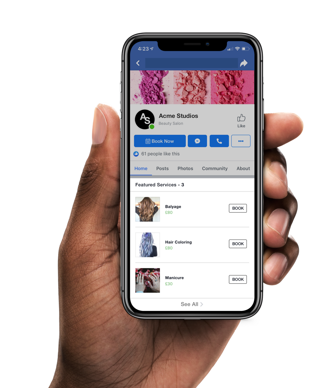 Your clients can easily book right from your business's Facebook page. Clients can view services, pricing, and business information synced from your Vagaro account.