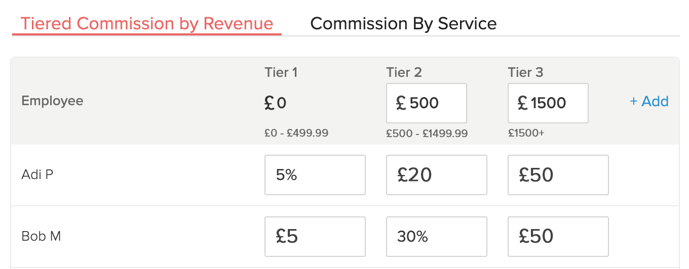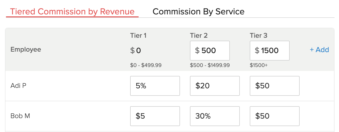 Use tiered commissions to encourage employees to sell more services and products. As performance increases, employees earn a higher commission rate. Create as many commission tiers as you want for service, class, and product sales.