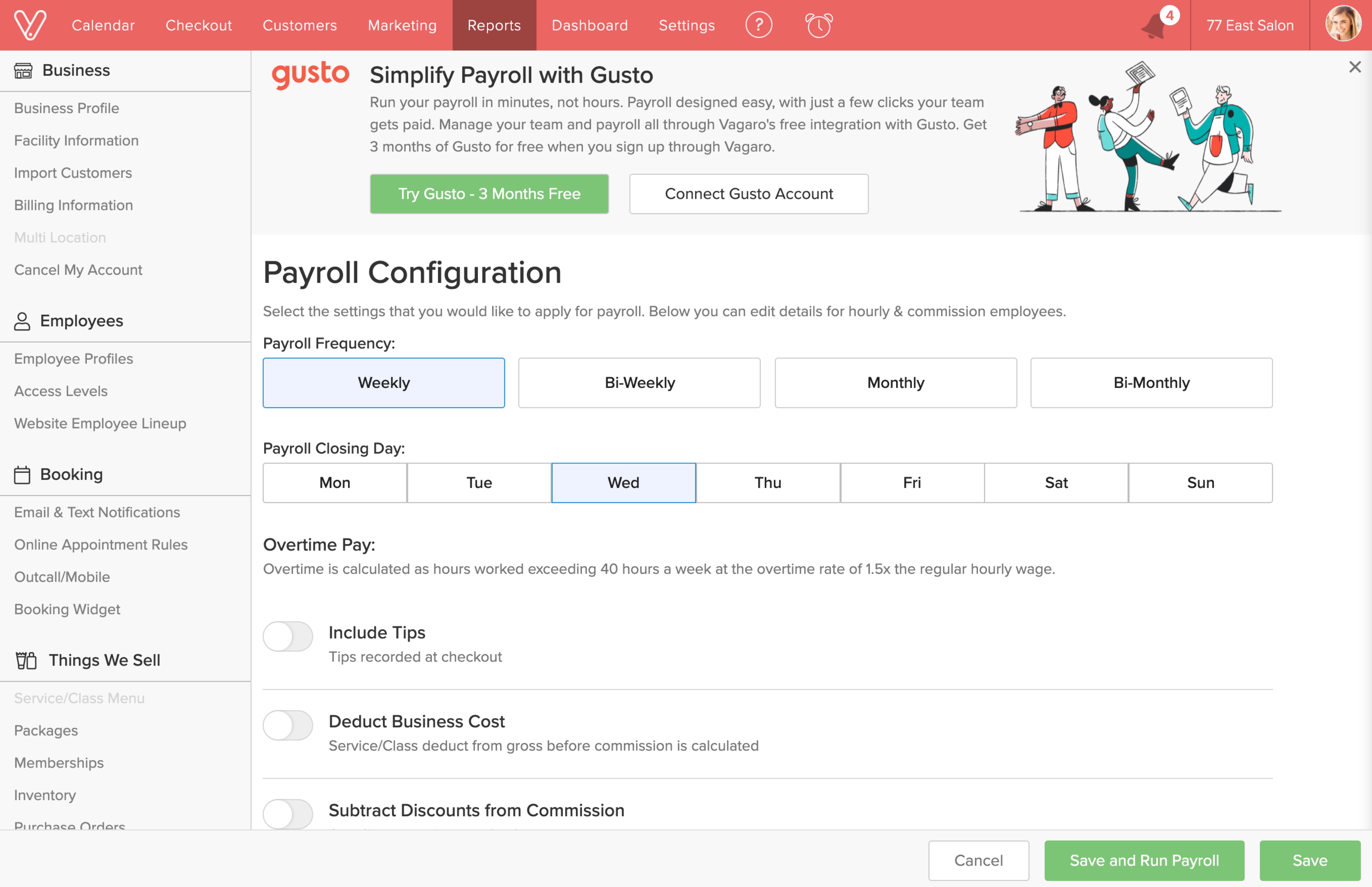 Vagaro’s partnership with Gusto payroll service lets you automatically pay employees by check or direct deposit and files your taxes for you. When you integrate Gusto through your Vagaro account, you’ll get three months of Gusto payroll service for free, including: